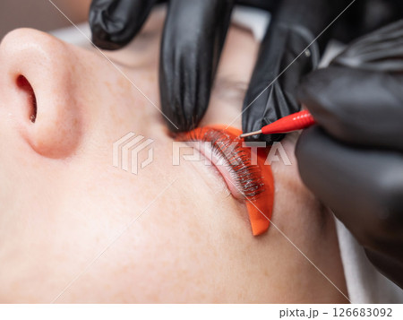 Caucasian woman undergoing eyelash lamination procedure. Top view.