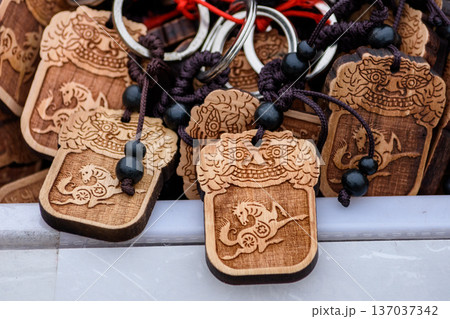 Hand-carved Chinese Lunar New Year of the Horse wooden keychains with traditional motif