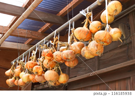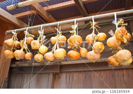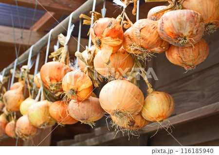 つるして干したタマネギの画像素材(写真・イラスト) 1ページ目