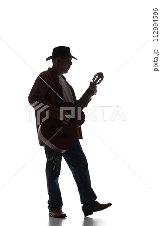 Silhouette of man in fedora hat playing guitar, performing isolated on white background. Black and white image.