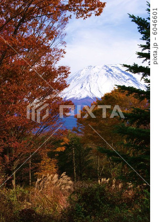 背景素材・手前雑木林の紅葉と冠雪富士・縦位置ハガキ対応比