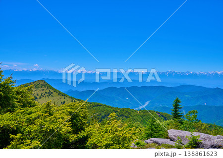 新緑の群馬県吾妻郡嬬恋村の湯ノ丸山頂から西側の眺望(烏帽子岳,北アルプス,大道山など)
