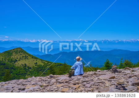 新緑の群馬県吾妻郡嬬恋村の湯ノ丸山頂から西側の眺望(烏帽子岳,北アルプス,大道山,登山者など)