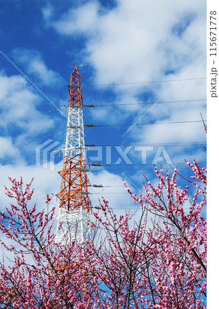 青空に映える紅梅と紅白の鉄塔