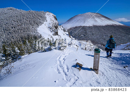 冬の長野県小諸市の黒斑山付近の槍ヶ鞘から浅間山を眺める女性登山者