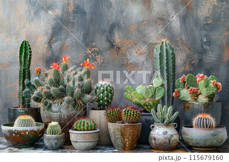 Huge succulents and cactus plants in different forms, flower pots, sizes and lengths on vintage