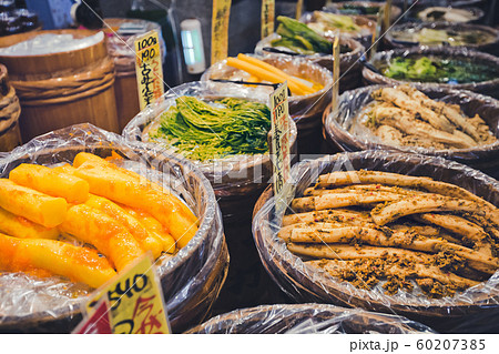 Various pickled vegetables at Nishiki market, Kyoto, Japan