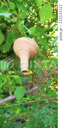 夏7月木の枝にドロで作ったトックリ蜂の巣