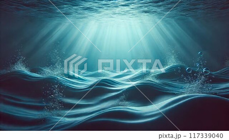 青い海の中で微笑む人魚の美少女。光が差し込み魚が泳ぐ。