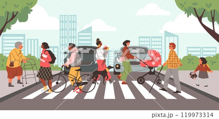 Pedestrians crossing street zebra, vector crowd of diverse people crossing road at crosswalk, transport traffic control