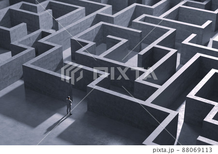 巨大な迷路と立ちすくむビジネスマン / ビジネスの難題・果てしない試行錯誤・困難な道のりのイメージ