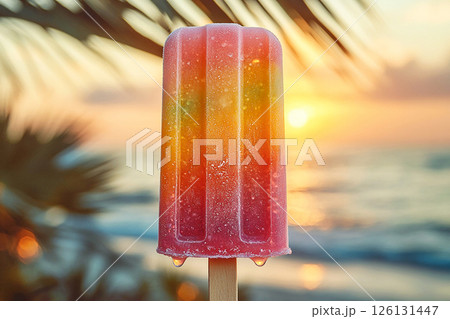 Popsicle with rainbow colors on a long stick on a summer background. Summer fun. Retro style.
