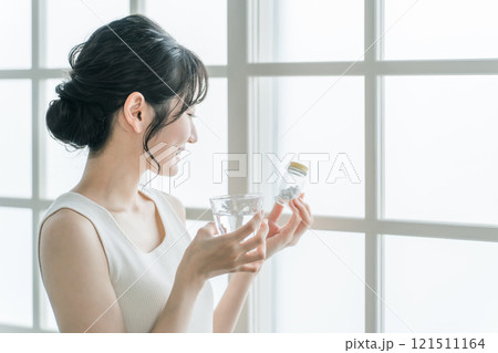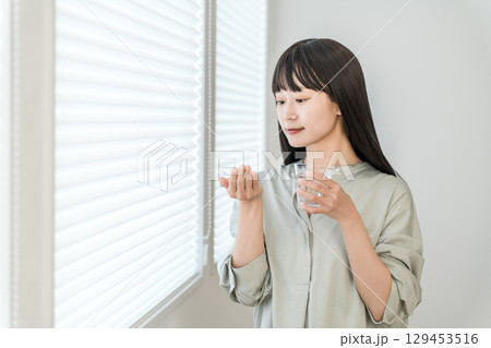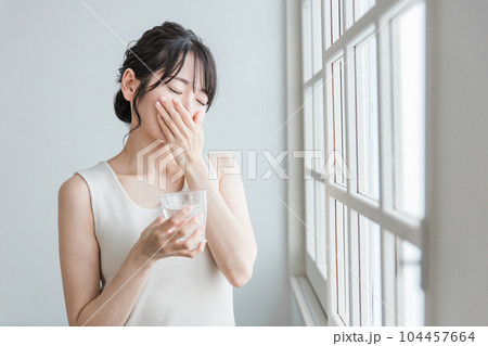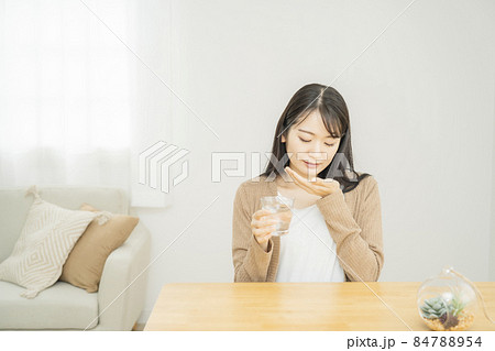 服薬・薬を飲む頭痛・体調不良のアジア人女性