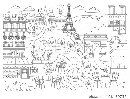 Vector Paris black and white landscape illustration. French capital city scene with sights, buildings, Eiffel tower, bakery. Cute France line background with river, field, park, castle, palace,