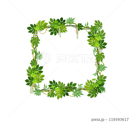 Tropical jungle frame with forest liana branch and leaves. Cartoon vector decorative square border made of lush exotic foliage and entwined vines for nature-inspired game menu or photo portrait