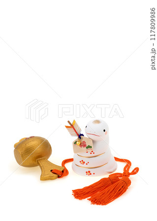 巳年 年賀素材 破魔矢を持ちとぐろを巻く白巳と打出の小槌