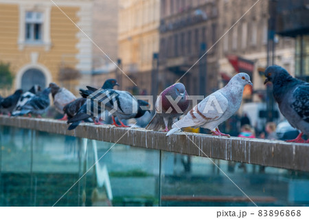 Pigeon birds standing together. Portrait of birds. Group of pigeons and the dove.