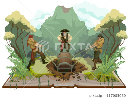 Pirates dig treasure chest island treasure open book illustration