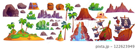 Cartoon pirate and corsair game assets, vector UI. Treasure island, chest and map in bottle, sunken ship, black flag and skull. Corsair treasure cave, rum barrels, landscape palms and mountain