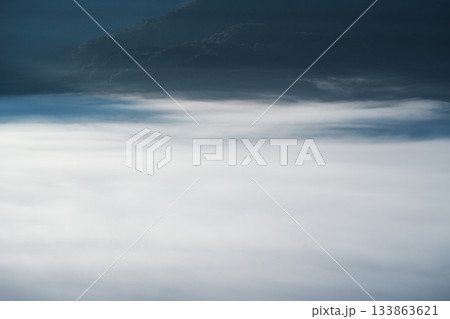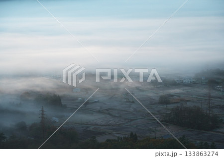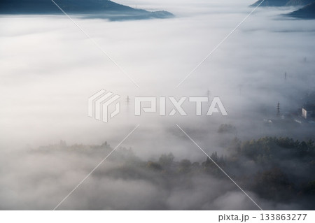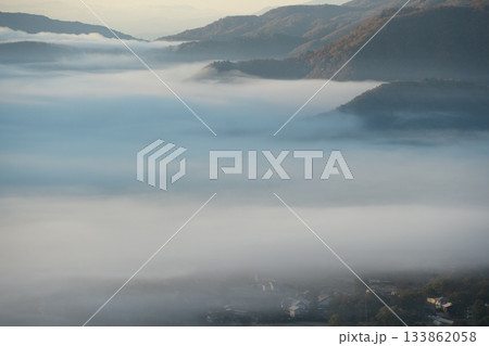 秋のどんぐりパノラマ展望台から雲海に沈む白馬村を望む