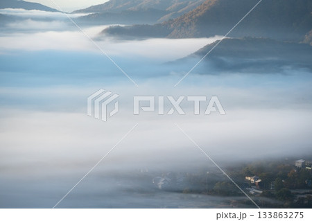 秋の白馬村どんぐりパノラマ展望台から雲海に沈む白馬村を望む