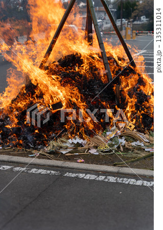 冬の屋外で燃えるどんどやの巨大なやぐら、日本の伝統的な正月行事