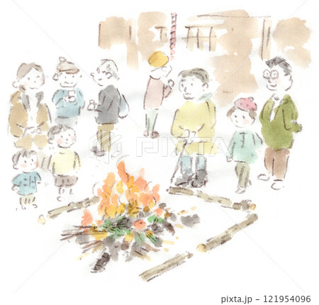 1月の地域行事、どんど焼き(左義長、とんど)のお焚きあげ風景の水彩画イラスト