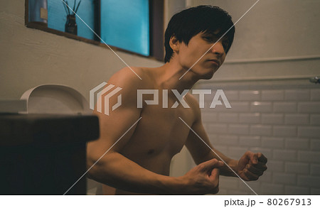 トイレに座る裸の男性