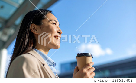 夏の入道雲の下でコーヒーを飲む20代の日本人OL ビジネス
