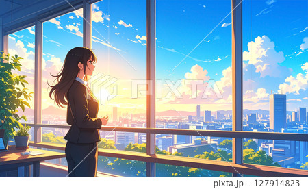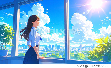 夏の入道雲が見える会社のオフィスで休む20代の日本人OL ビジネス