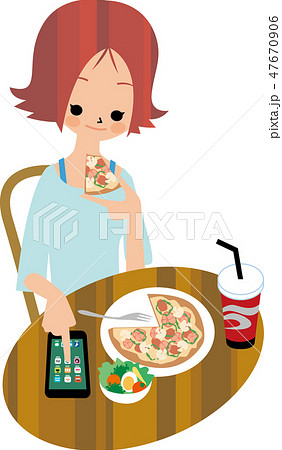 スマホをいじる女子のイラスト背景無・雑誌有・人物中央・カメラ目線版