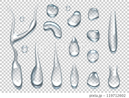 Water drops. Transparent rain droplet. Fresh cool dew surface and realistic clear raindrop. Vapor splatter. Pure wet splash. Liquid bubble. Falling tear. Aqua condensate. Vector objects set