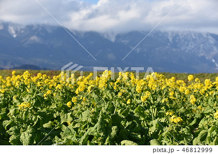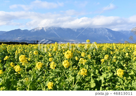 菜の花畑と雪山の背景