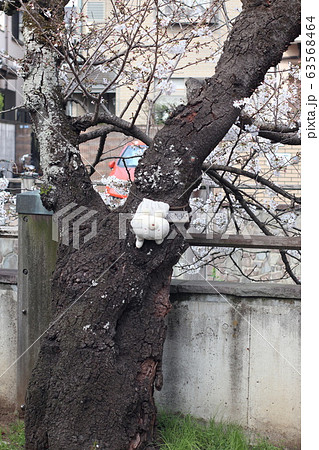 桜の木に括り付けられたうさぎのぬいぐるみ