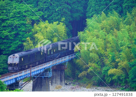 久大線の山中を行く、豪華寝台列車 ななつ星in九州