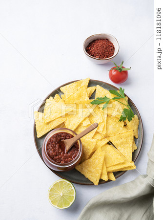 Nachos or tortilla with spicy tomato sauce on a plate with fresh lime on a light background