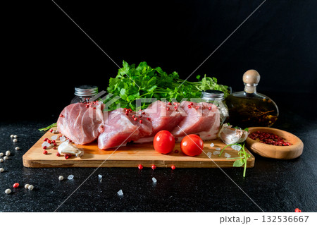 Raw Meat with Tomatoes Garlic and Parsley on Cutting Board
