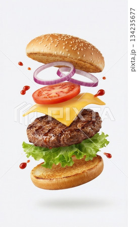Delicious Beef Burger Ingredients Flying In The Air Isolated