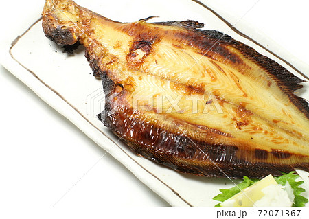 焼き魚、こんがり焼かれたなめたカレイの干物、白バック