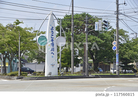 「ようこそ滑川へ」と書かれた看板(富山県滑川市)