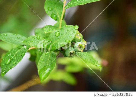 雨に濡れる鉢植えのブルーベリー