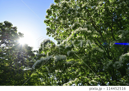 ヒトツバタゴの街路樹が咲き誇る風景