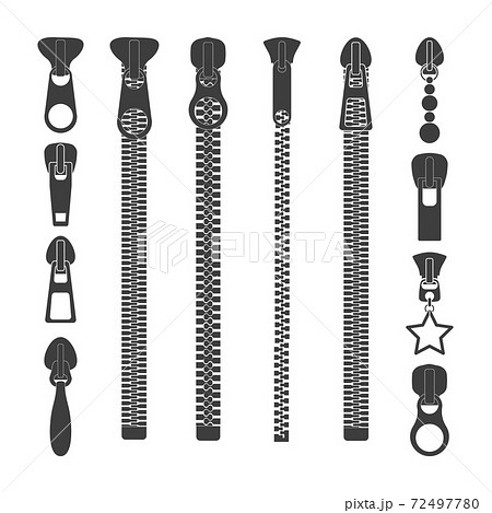 Zip pull icons. Zipper black silhouettes, closed and open zip lock stock collection, various forms textile and fabric zippers fastener, sewing tools for clothes vector isolated set