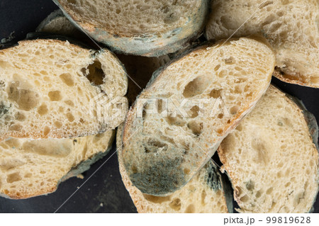 Mold on bread on a black background close-up. The danger of mold, stale products.