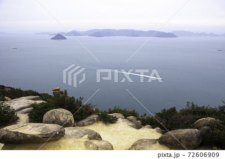 岡山県玉野市の王子が岳山頂付近から見た名物岩と瀬戸内海