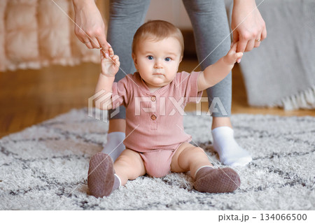 Adorable little kid holding mother hands, sitting on floor, ready for making first steps, copy space. Beautiful blonde baby sitting on carpet at home, holding mummy fingers, looking at camera, closeup