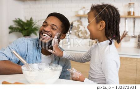 Happy african dad and daughter having fun while cooking pastry at home, girl slapping father face with flour palm