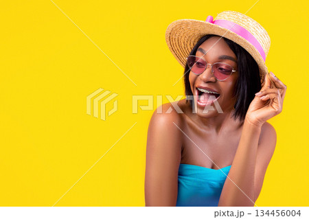 Flirty young black woman in summertime outfit opening mouth in excitement, posing on orange studio background. Playful African American lady looking forward to summer vacation
