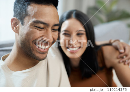 Couple, face and happy on sofa with love, bonding and relax for relationship in living room of home. Care, woman and man with smile on couch in lounge of house for peace, embrace and freedom or laugh