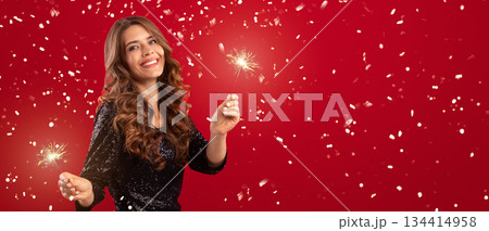Gorgeous millennial lady in sexy evening dress partying with sparklers on New Years Eve over red studio background, panorama. Pretty young woman having great time at Christmas party